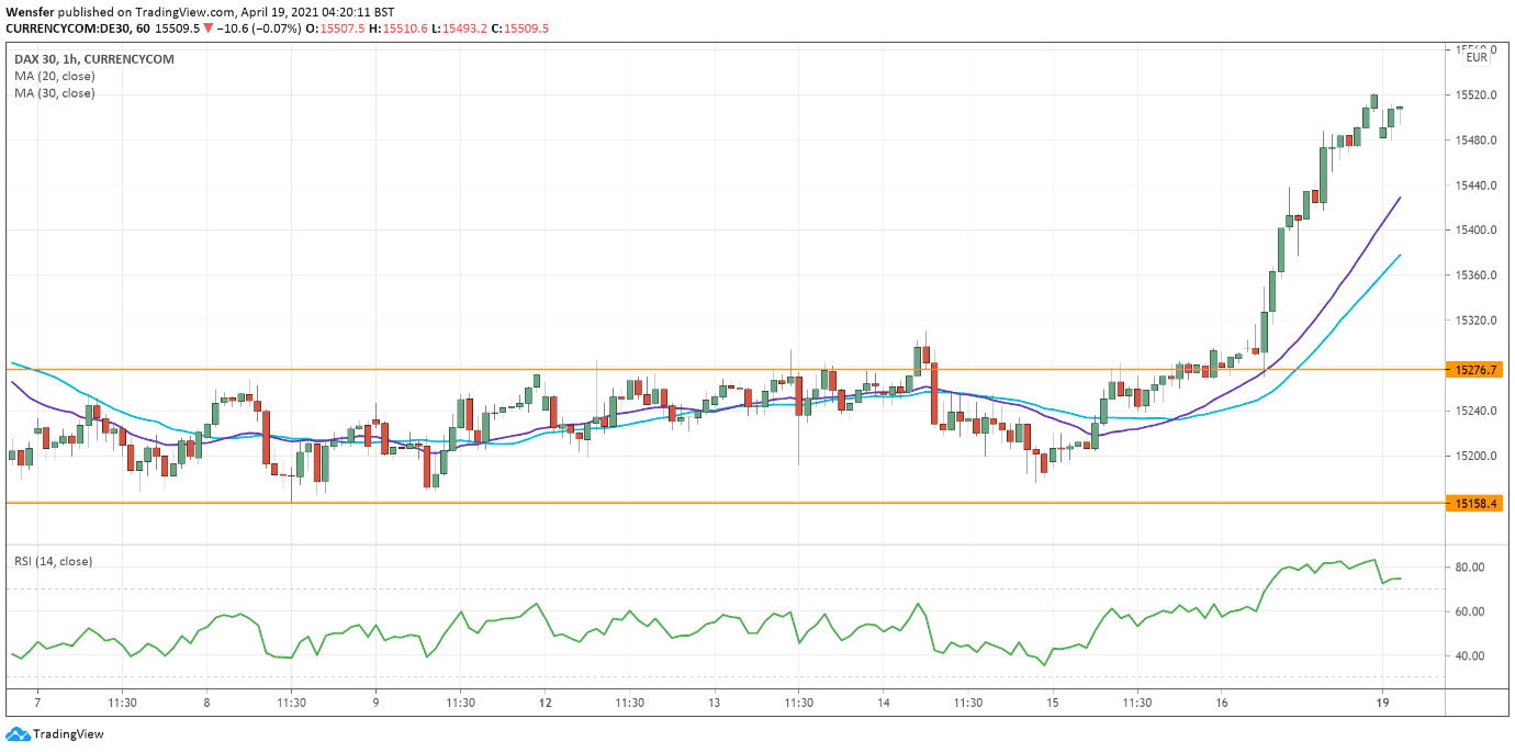 The 20-hour moving average crossing the 30-hour one is the final confirmation that the uptrend is picking up speed again. 15270 is the demand zone if the index falls back in search of more bids.