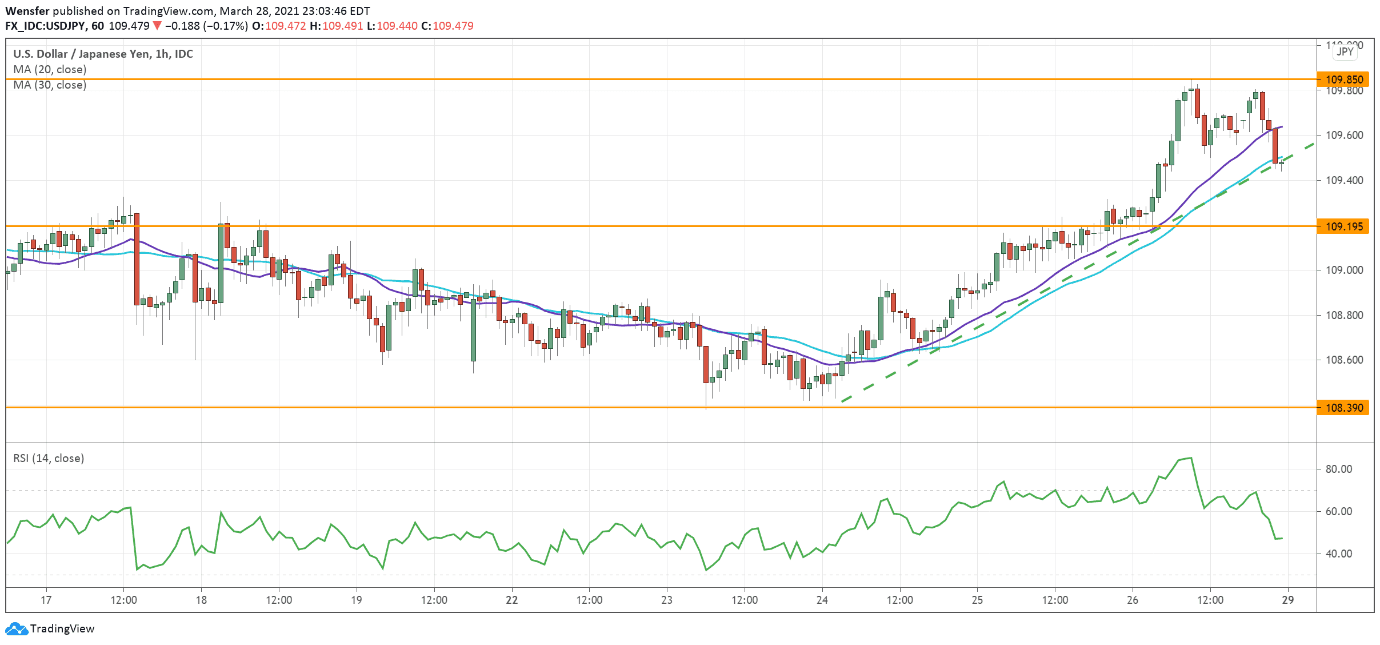 In that case, the rising trendline and 20 and 30-hour moving averages would become the demand zone. A deeper retracement may find support from the former resistance at 109.20.