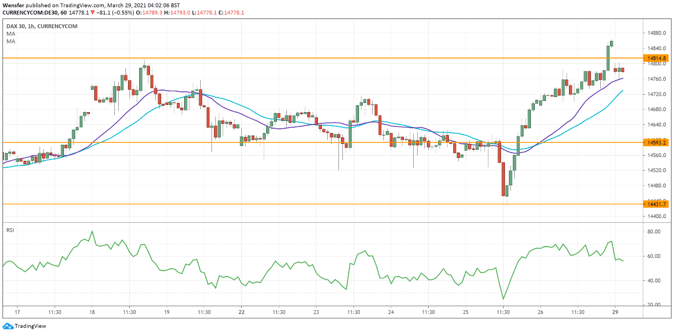 Solid momentum above a bullish MA cross confirms that buyers are still in control of the price action. A close above 14800 may convince more trend followers to join in and push the index higher.