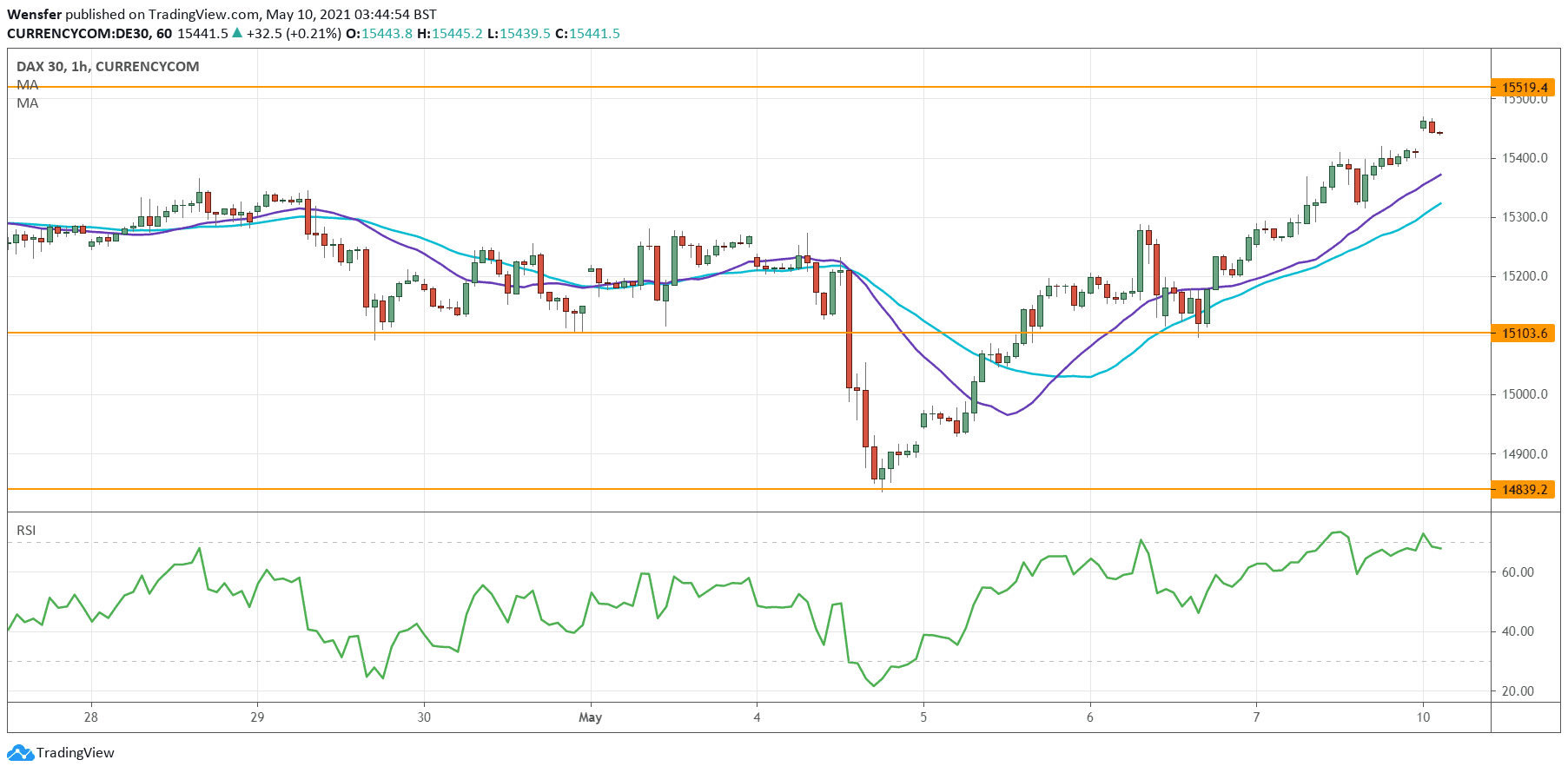 The index then established support at 15100. As it climbs back towards the peak at 15520, an overbought RSI could be the rally’s Achilles�heel.