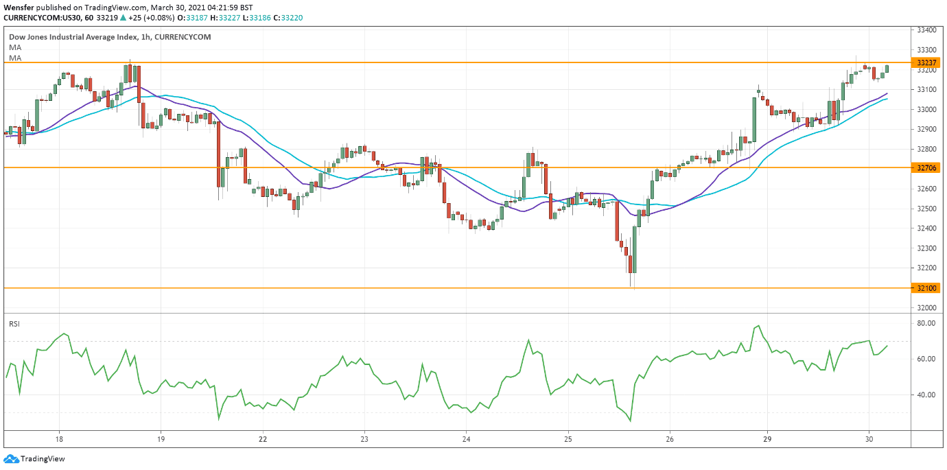 After rallying above the former resistance at 32500, the Dow Jones is making an attempt at the previous high at 33250. A bullish breakout could extend the rally to new record highs.