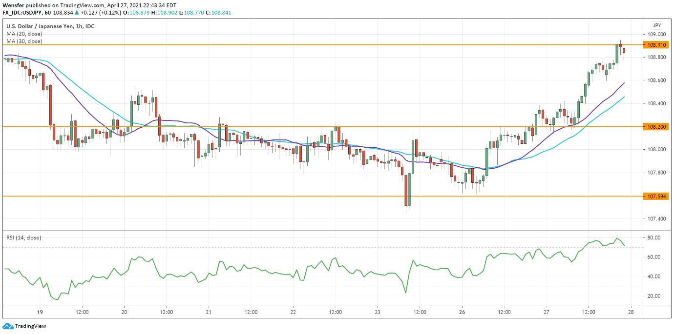 As the RSI shows an overbought situation, 108.20 would be the first support In case of a retracement.