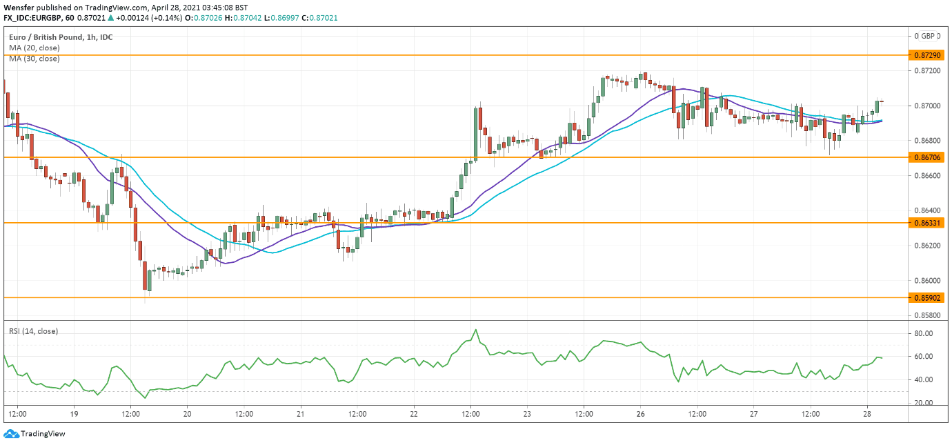 Euro buyers are encouraged by news of easing of restrictions in Italy and France. The pair has risen back to the major support area around 0.8720-0.8730.