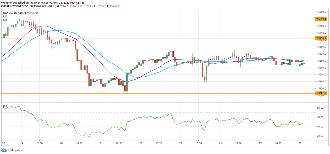 The German index stagnates as the earnings season kicks off in Europe. Last week’s sell-off below 15180 was a sign that buyers took profit after the index made a series of record new highs.