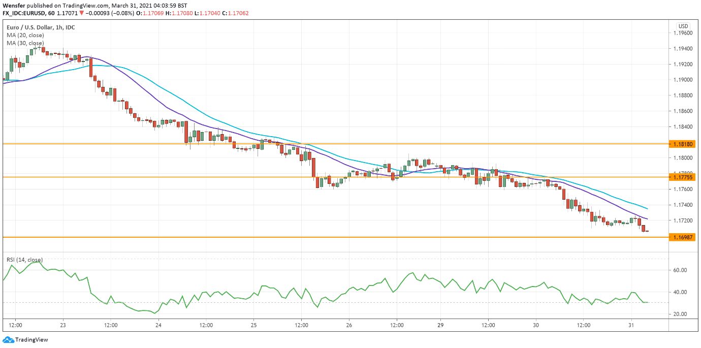 After a short pause along the 20 and 30-hour moving averages, the sell-off renewed below 1.1760. A further drop below the psychological level of 1.1700 could drive the price towards 1.1600, a critical support level for the ten-month-long rally on the daily chart.