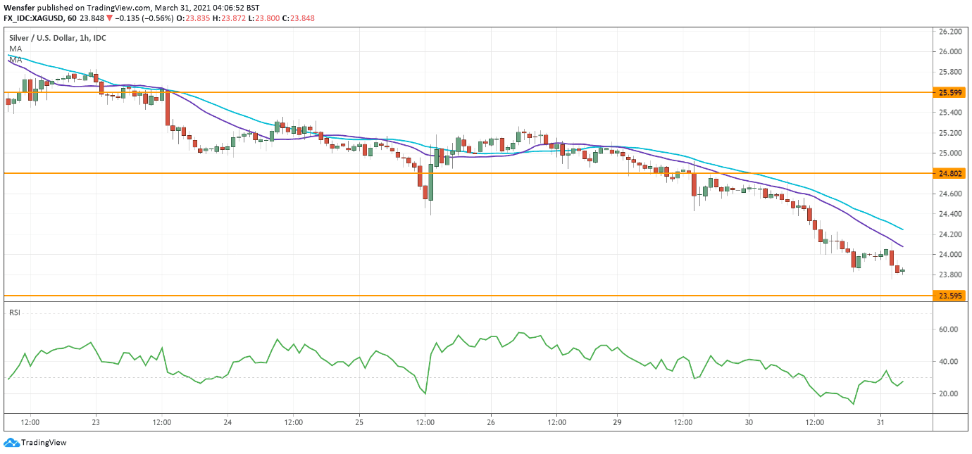 The price has retreated to January’s low at 24.00. Profit-taking from short-term traders may help lift bids while an oversold RSI recovers into neutrality.