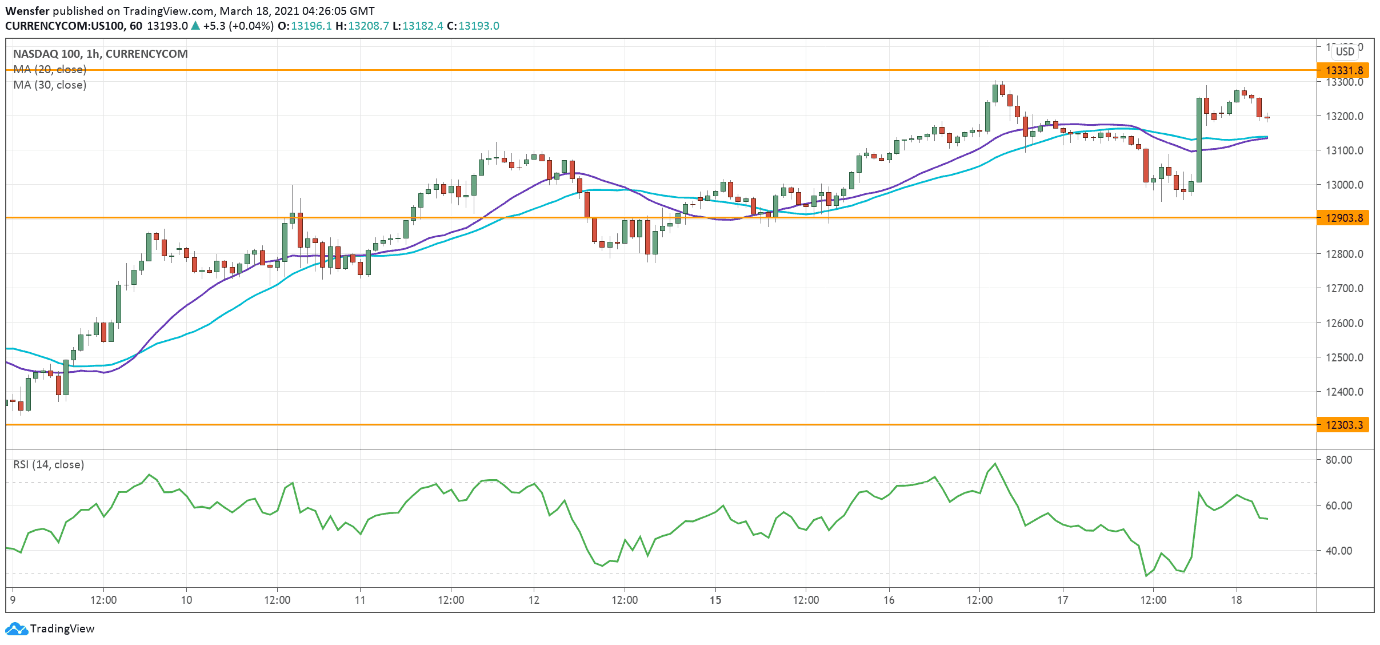 FOMC officials�pledge to keep the monetary policy accommodative has pumped up the appetite for risk assets. After reaching near the March high of 13330, the tech index saw profit-taking as the RSI shot into the overbought zone.