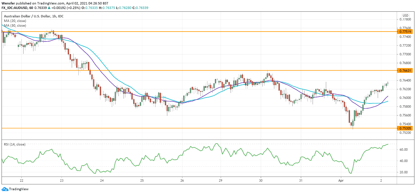 An oversold RSI has triggered some short-covering, but the current rebound may attract more sellers in the supply zone around 0.7660.