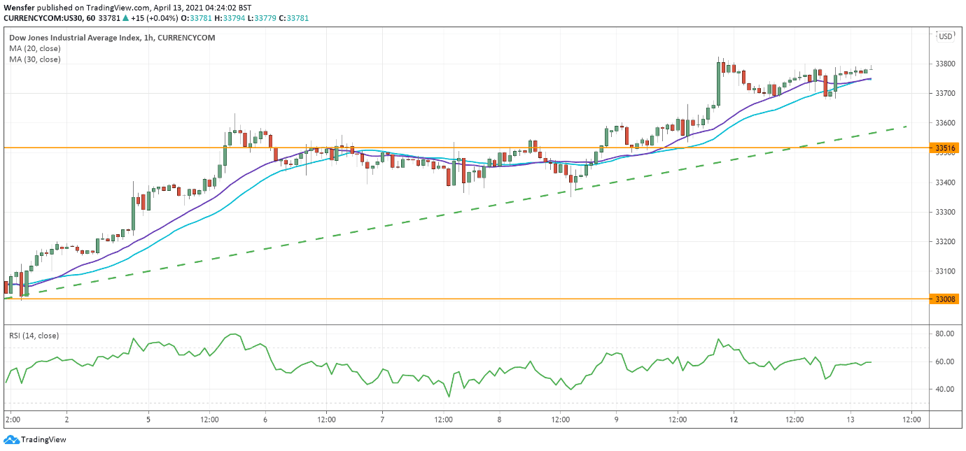 Following a breakout above its latest consolidation range (33250), the index has been grinding up along a rising trendline.