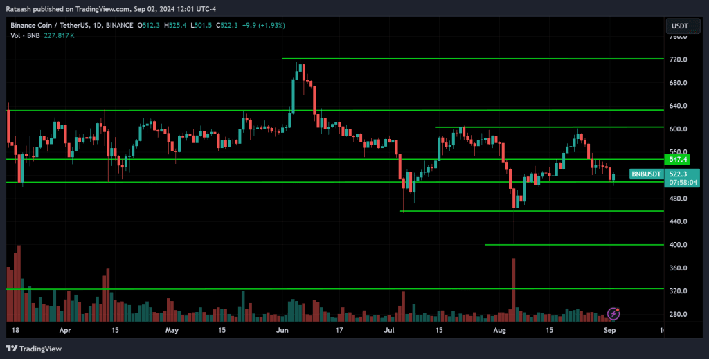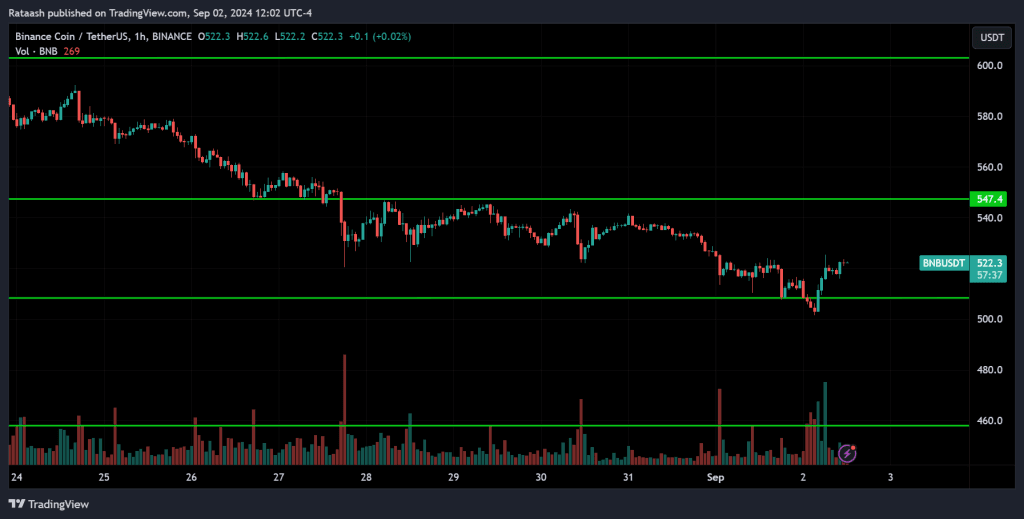 BNB is currently consolidating, with the price pulling back up from the 500 support and heading toward the 550 resistance. If the price breaks above 550, we can expect it to move up to 600. However, if the price breaks below 500, we can expect it to drop to 460.