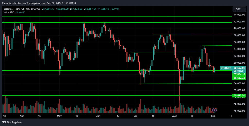 BTC is also consolidating, with the price currently above the 56500 support. There is resistance around 60000, and if the price breaks above this resistance, we can expect it to move to 61200, and if that level is also broken, then toward 63000. On the other hand, if the price breaks below 56500, we can expect it to continue dropping to 54000.