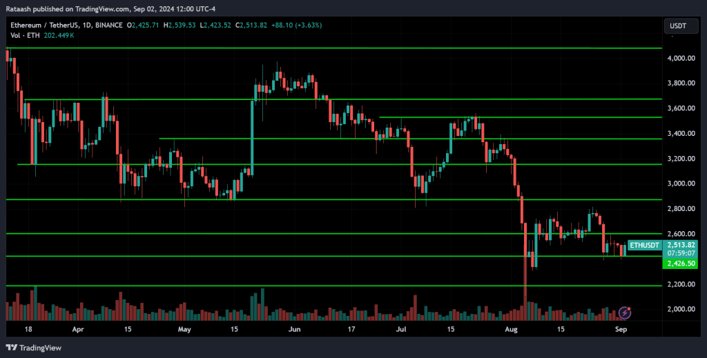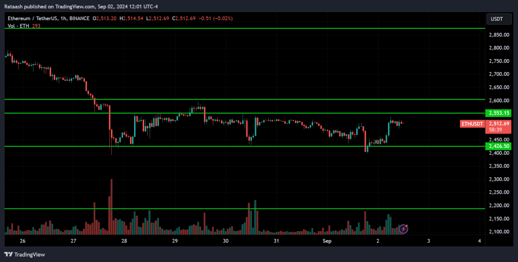 ETH is trending down. On the 1-hour chart, the price is consolidating between the 2400 support and the 2600 resistance. If the price moves above 2600, we can expect it to head toward 2850. However, if the price breaks below 2400, we can expect it to drop to 2200.