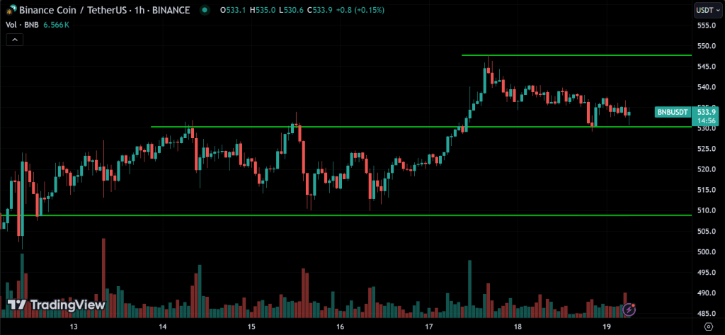 BNB is mostly trending down, but it’s in an uncertain phase right now. The price is currently at the 530 support level. If it breaks below this level, it could drop to 510. However, the price might also start going up from 530 and move toward 550. If it breaks above 550, we could see an uptrend.