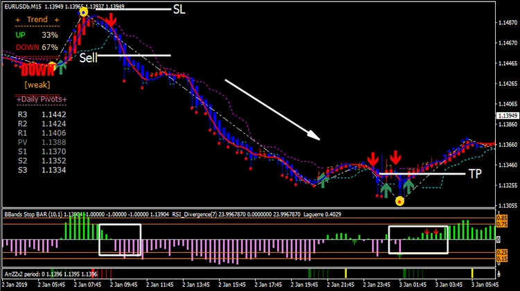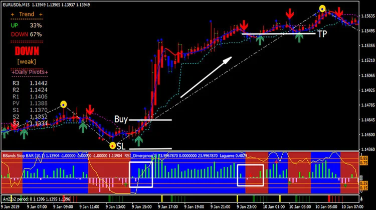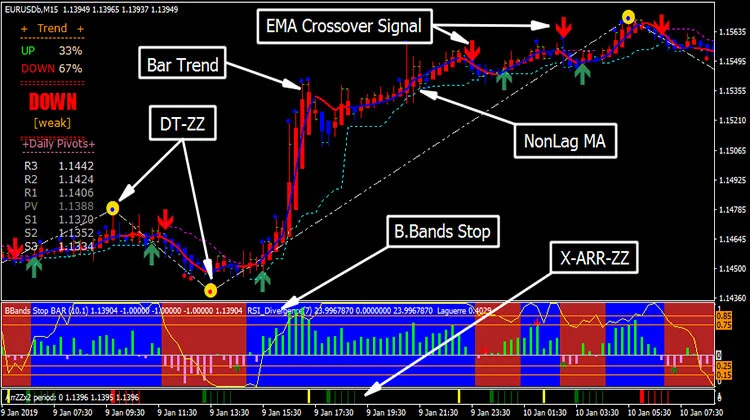 - X-ARR-ZZ: Works as a trend signal filter. It plots green bars to signal the validity of the bullish trend and red bars to certify the bearish thrust of the current market trend.