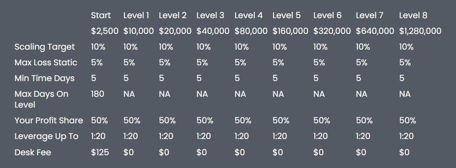 It has an exciting scaling plan. Your trading capital gets upgraded for free if you can profit 10% of your capital without breaching rules. You have 180days to upgrade to the first level; For levels after that, there isn’t any time limit. Remember that you must pass to level 1 before the 180days time limit ends. And same as other challenges, you need to trade for at least five days too.