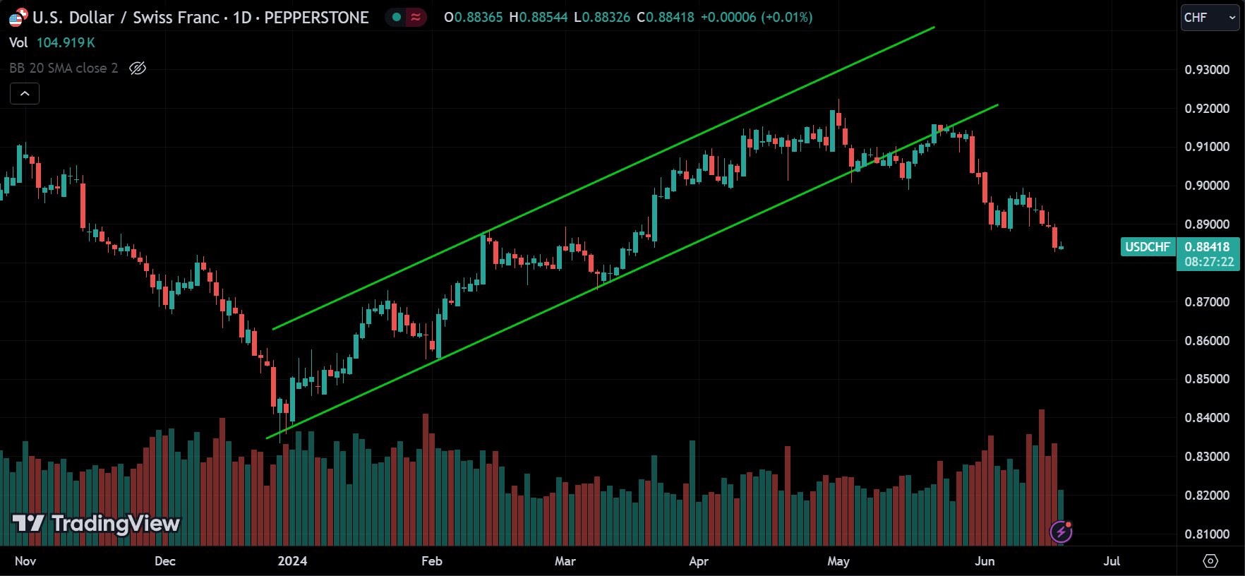 Formed by drawing parallel lines along the support and resistance levels of an upward trending market. The lower line represents the support, and the upper line represents the resistance. This type of channel indicates that the currency pair is experiencing higher highs and higher lows, suggesting a bullish trend.