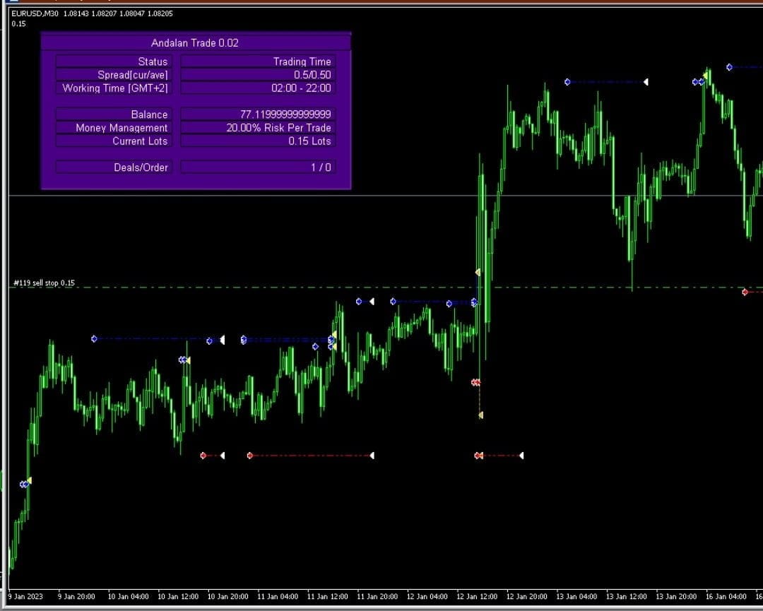 Andalan Trade EA can be used with a Minimum Account Balance of 20$. It works using by placing pending orders buy stop and sell stop. It has a hidden take profit and stop loss. EA scalps a small number of points on average from 1 to 10