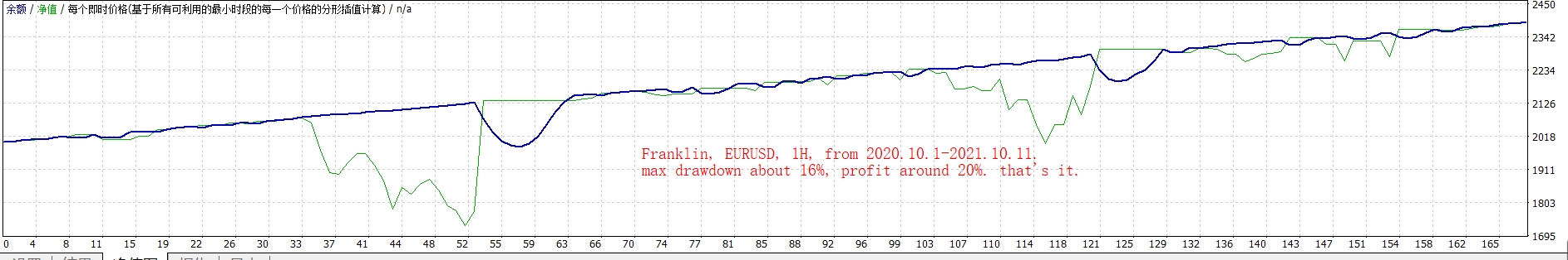 The Franklin EA uses averaging to cope with loses. This means the Ea will eventually implode in a large trend unless you close the positions manually or add some sort of equity guardian.