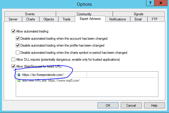 Open Tools –> Options –> Expert Advisors. Check the option â€?strong>Allow WebRequests for listed URLâ€?Add the following: “https://ec.forexprostools.comâ€?and press “OK.â€?The EA takes news from the specified websites.