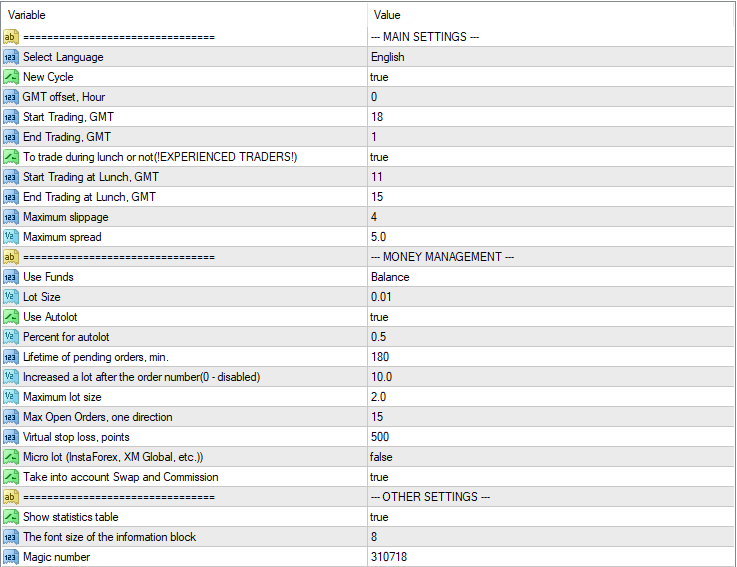In a forex advisor, you can use the “Micro lot (XM Global, etc.)�parameter regardless of the broker, but at the same time make 10 times less profit, which accordingly reduces the risk of drawdowns, for example, with a small initial deposit. However, this parameter should be enabled for such brokers as InstaForex, XM Global, etc., whose lot value is 10 times less than usual.