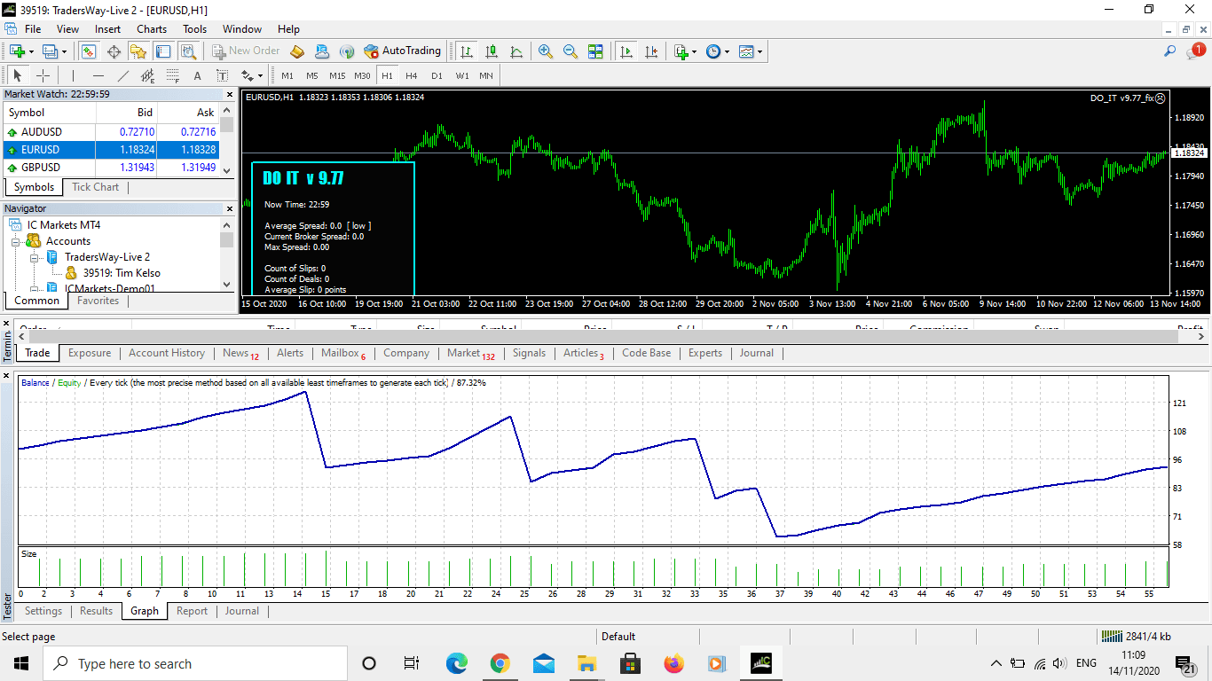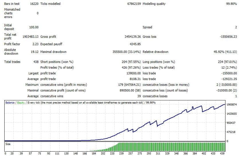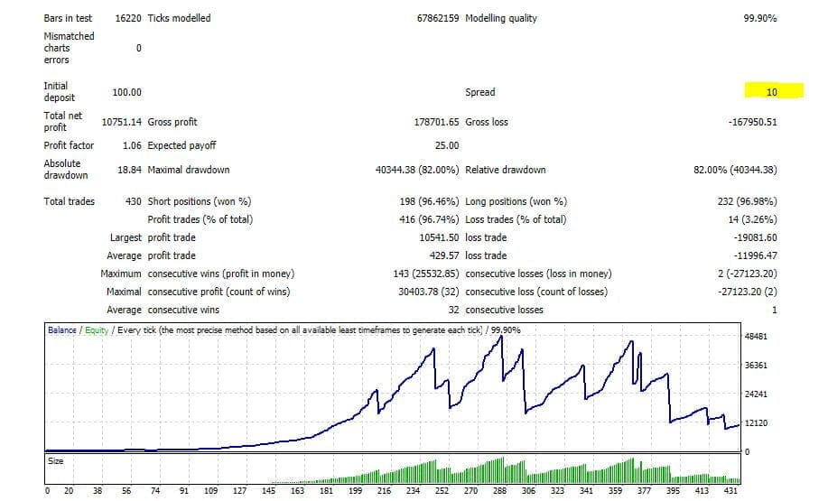 Saludos, he tenido muy buenos resultados con mis pruebas pero debe ser un broker como VT markets cuentas ECN con spread de 0, podemos cambiar el numero que tiene del stop loss recucirlo a 110 y aumentando el riesgo al maximo