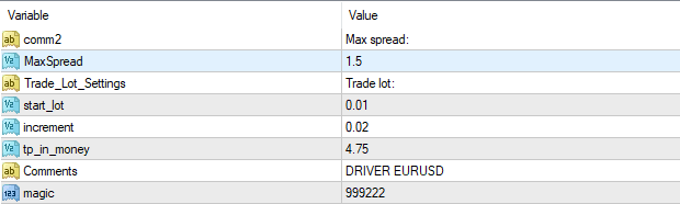 - For a standard account, star_lot is 0.01, then increment is 0.02 (how much to add to the next order), tp_in_money is 4.75 (take profit in money)