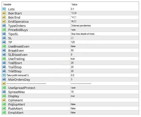 It trades based on the breakout of specific ranges. All parameters are configurable: SL and TP size, position size (volume), BreakEven and dynamic SL, partial taking, maximum daily trades, spread margin, analysis hours, and operating hours.