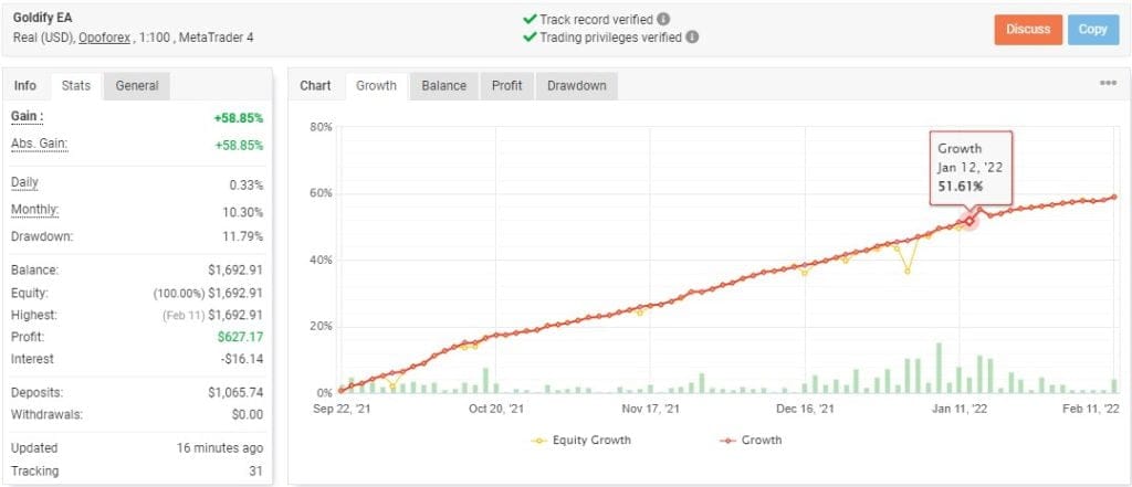It is designed and programmed to trade only for above 84% accuracy and if the trades get in drawdown, it will use the grid method to close them in breakeven without loss. The Goldify EA has been developed for the XAU/USD to gain 20% to 38% Monthly Profit.