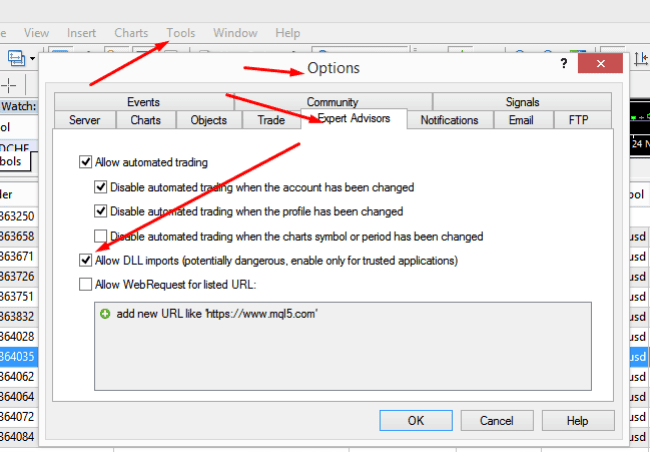 - Go to Options > Expert Advisors and Tick on Allow DLL Imports. (It’s Very Important)
