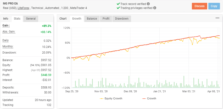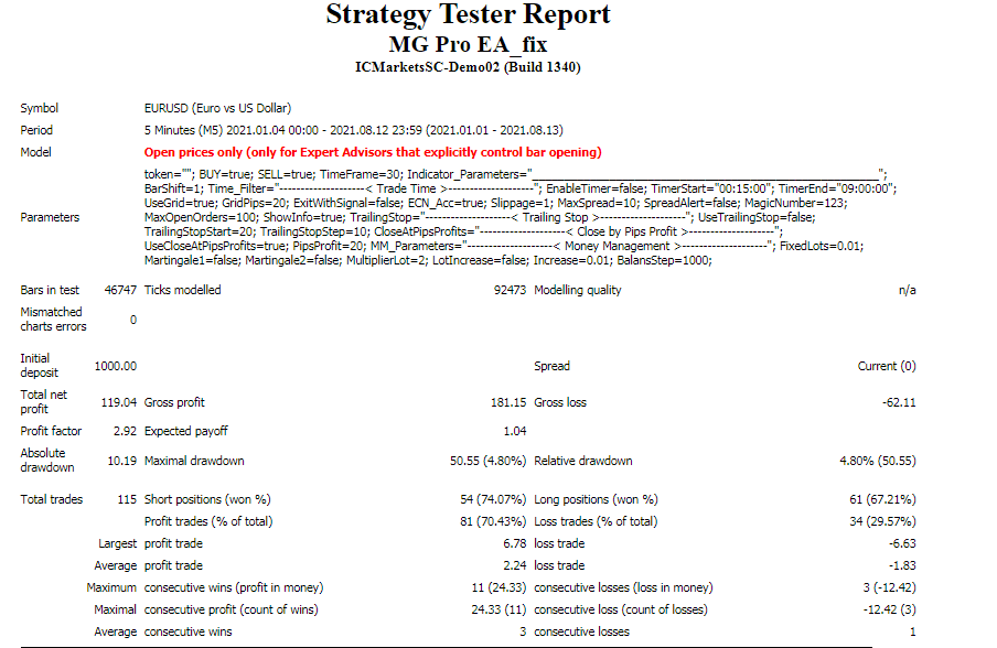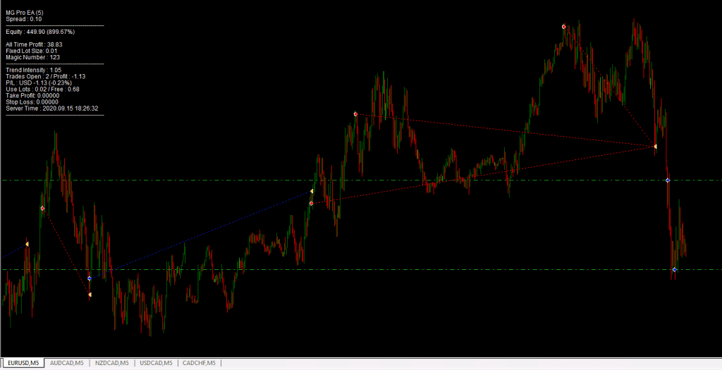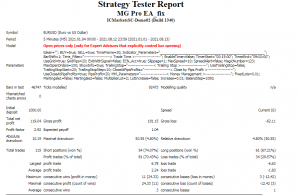 MG PRO is a fully automated EA usually being sold for 450$. It works based on inner smart indicators which analyze the market in many aspects and place trades.