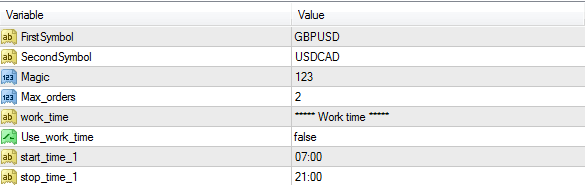 Recommend GBPUSD for the FirstSymbol but EURUSD works too and test with other symbols combinations on demo or strategy tester.