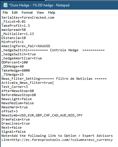 - Load “Ouro Hedge EURUSD Default.set” preset file or put anything in the “SerialKey” parameter