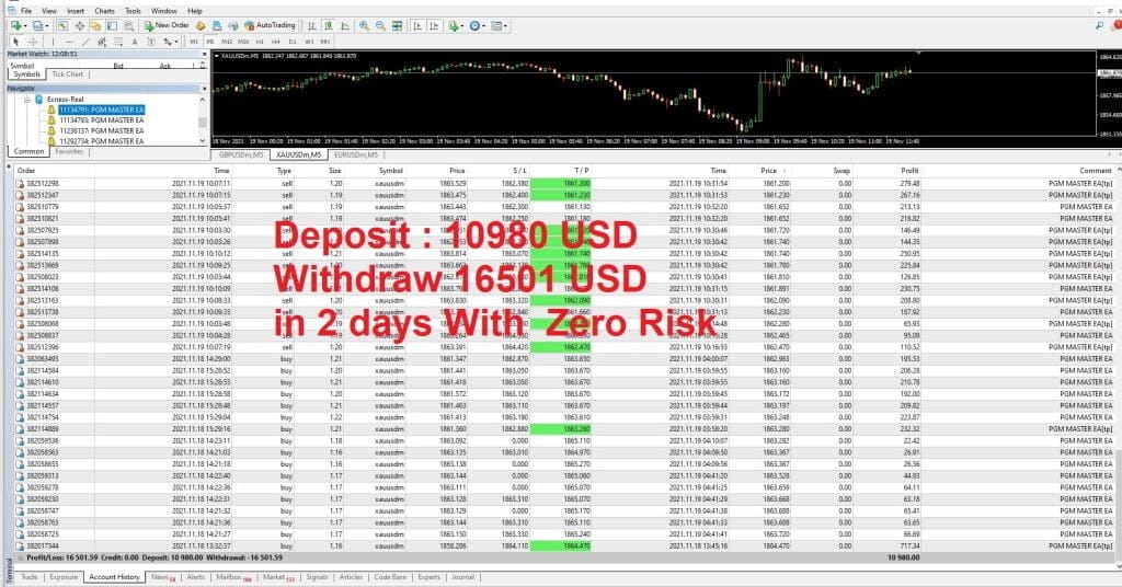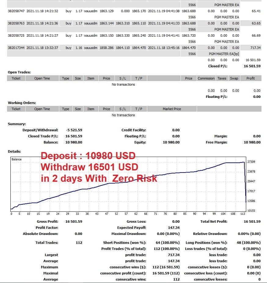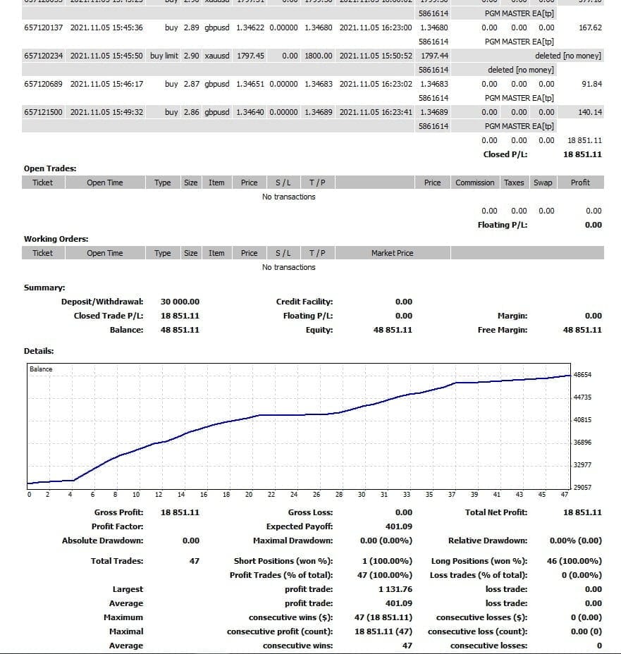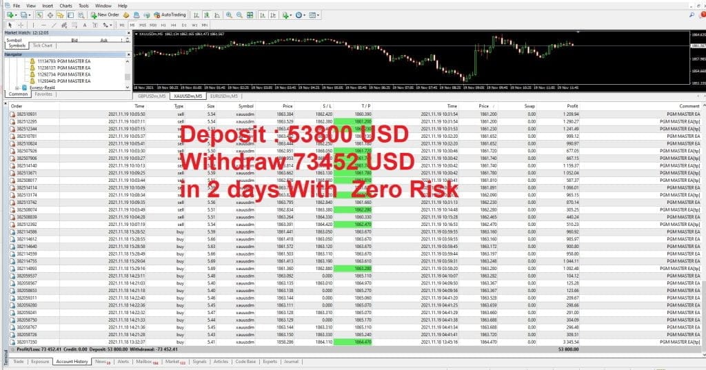 It uses multiple indicators to find market entries and aims for a profit factor of 2 or more. PGM MASTER EA uses a sophisticated algorithm that only calculates entries when markets are retracing. This prevents being exposed to sudden spikes. So you can set it up according to your risk appetite.