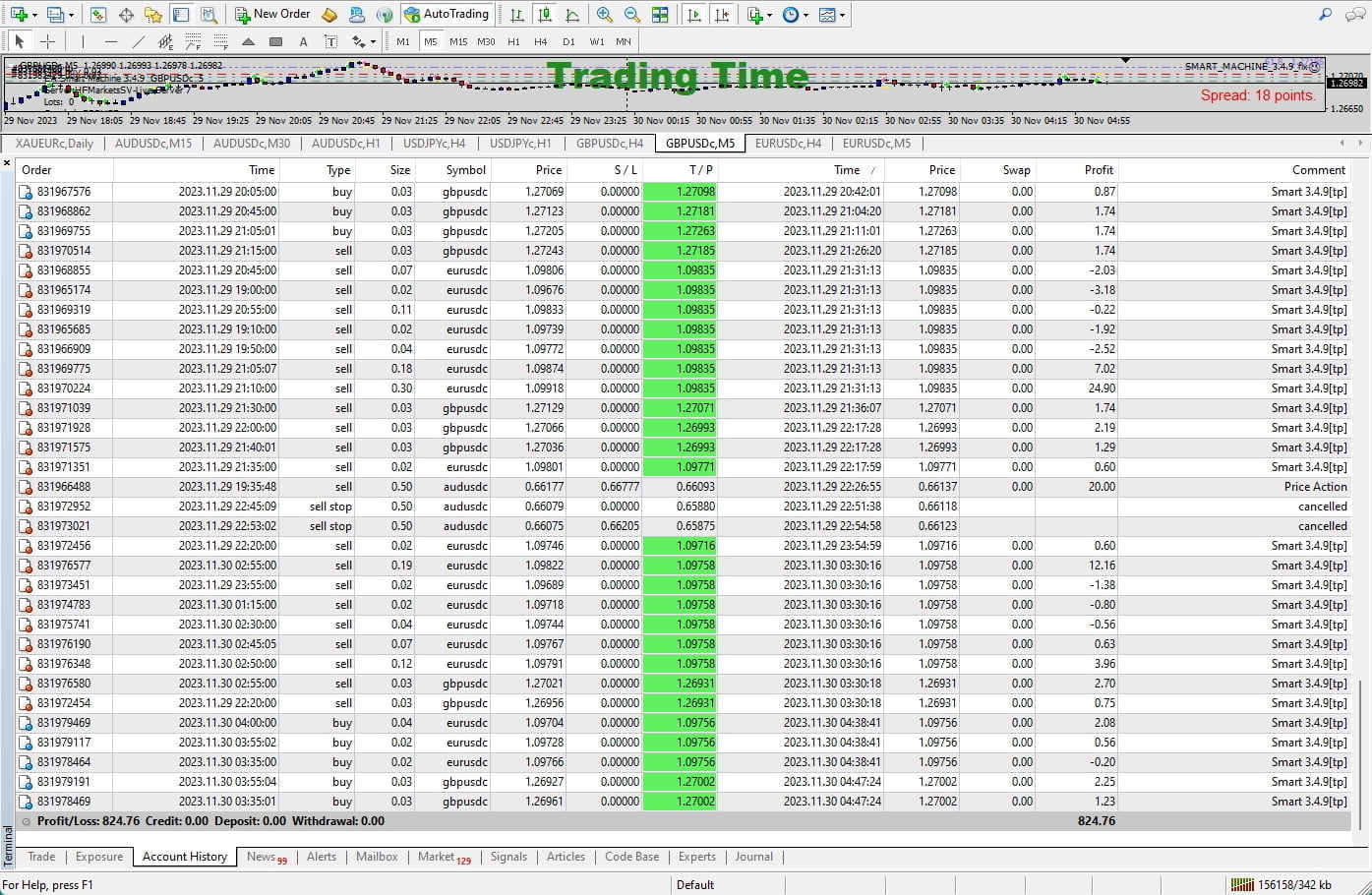 As you can see, the EA maintains a low drawdown (under 15%) while consistently securing small profits. The “Smart” algorithm detects trend reversals and pauses trading during high-impact news events (Non-Farm Payrolls, FOMC).