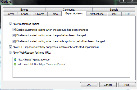 In order for the “News WatchDog” to function, you should checkbox “Allow WebRequestâ€?and add “http://news1.gegatrade.comâ€?into your WebRequest URL list