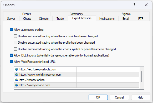 Open Tools –> Options –> Expert Advisors. Check the option â€?strong>Allow WebRequests for listed URLâ€?Add the following: “https://nfs.faireconomy.media” and press “OK.â€?The EA takes news from the specified websites.