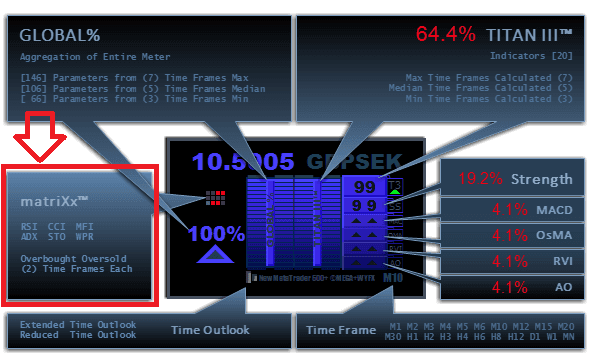 The twelve (12) matriXx dots represent possible Overbought or Oversold levels. When these dots illuminate, this may be an indication to begin to think about taking some profit. With possible OBOS price action, and thus visual indication from the matriXx dots, also brings possible upcoming turning points.