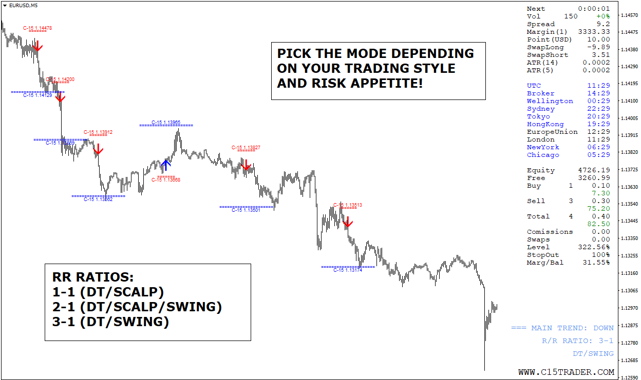- C15 3-1 provides the most conservative signals. It provides 3 to 1 Risk to Rewards trades. This mode is ideal for day trading or Swing Trading.