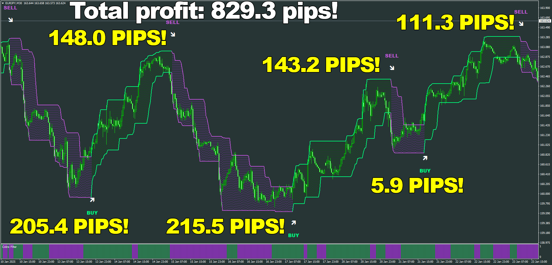 Cobra Scalper has great signals â€?that much is obvious. However, there is always room for perfection. We added our special confirmation filter to make trading with the Best Trading Indicator even more accurate and profitable. Using it is very simple: all you need to do is make sure that the color of the signal generated is the same as that of the Filter beneath it. That’s it!