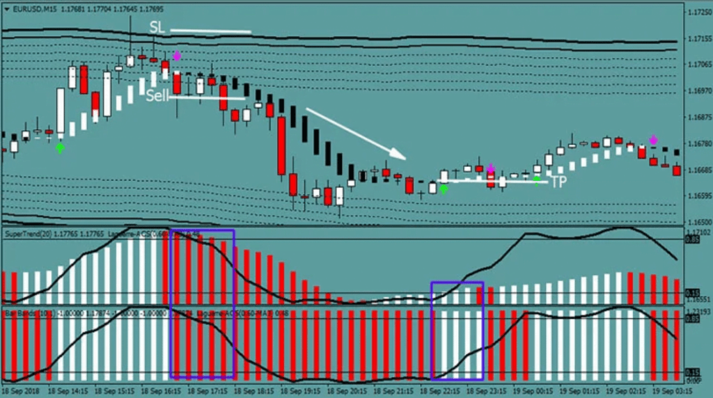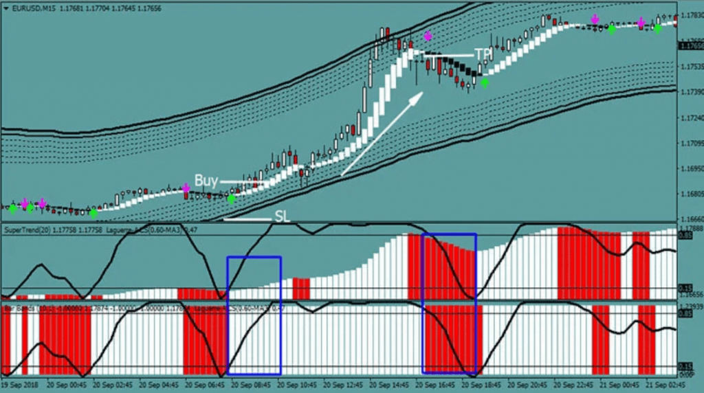 Super Trend & Bar bands:Â Both of these indicators work in the same manner to detect the current market momentum. Their value should be under 0.15 (oversold area) and their histogram bars should be turned white to confirm the long entry. Conversely, for a short entry, their value must be above the 0.85 level (oversold area) with their histogram bars turned as red.