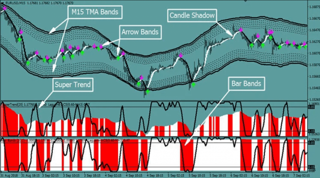 Arrow Bands: It signals the possible swing areas of the market. The arrows point to the next possible momentum direction. For trade entries, you’ll need to find upward arrows at the lower band to buy and downward arrows at the upper band to go short.