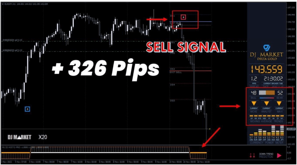 DJ Market Pro boasts a user-friendly interface that makes navigating and understanding the indicators a breeze. Blue arrows indicate a “BUY” signal, while red arrows signify a “SELL” signal, ensuring that even novice traders can easily interpret the data and make informed decisions.