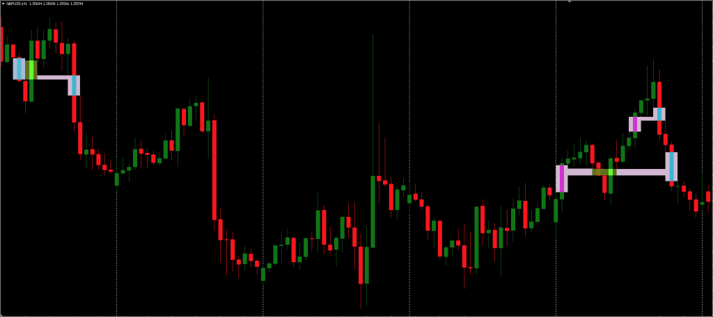 - Balanced Price Range (BPR) – Created by the overlap of two FVGs of opposite directions, forming a “bridgeâ€?in the price action. These areas typically represent zones where price temporarily stabilizes or revisits after an impulsive move, potentially offering opportunities for trade entries based on rebalancing dynamics.