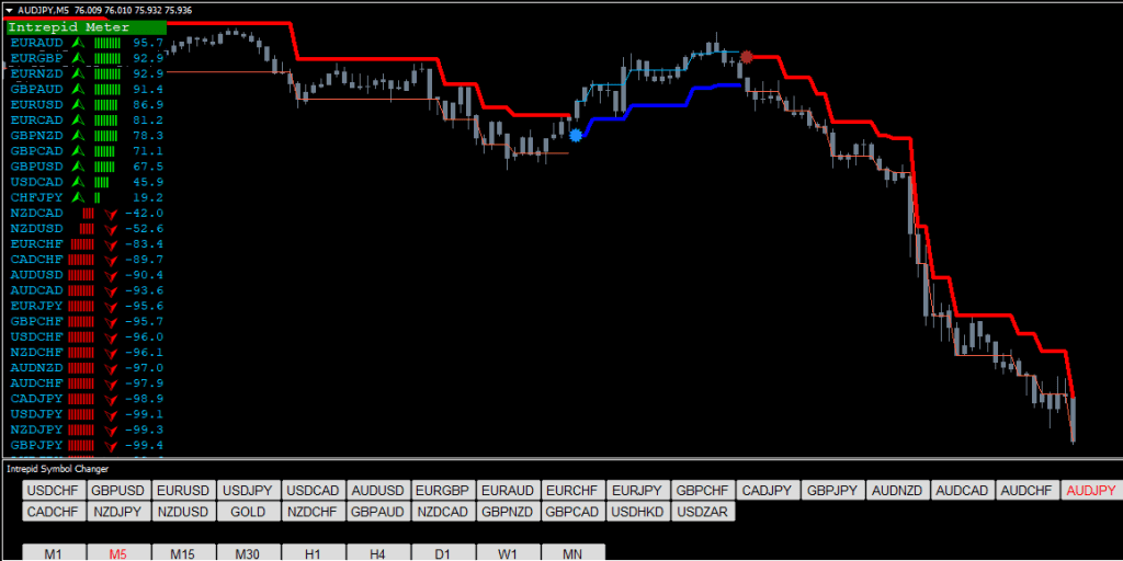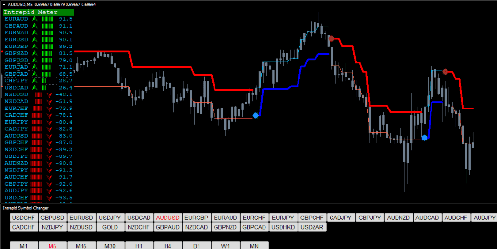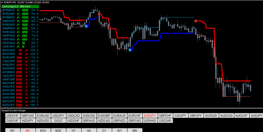 The Forex Intrepid Indicator System can be used on any Forex currency pair and other assets such as stocks, commodities, cryptos, precious metals, oil, gas, etc. You can also use it on any time frame that suits you best, from the 1 minute through to the 1-month charts