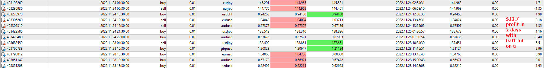 I had two trades closed at the take profits (audusd and eurusd), then hit a stoploss on usdjpy… and now hold a big winning trade on eurchf, all on 30 minutes time frame.