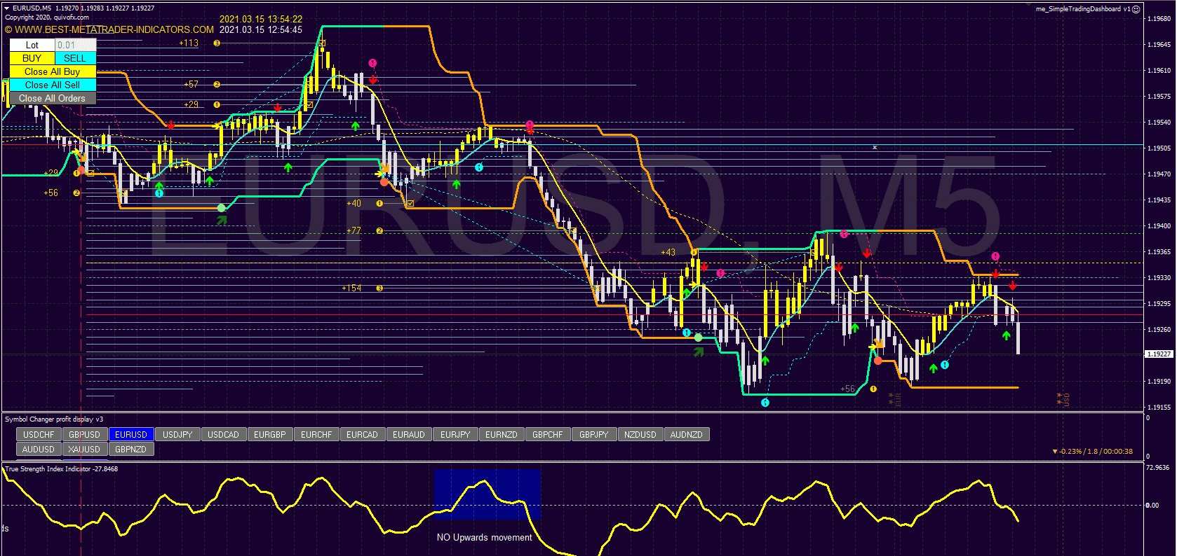 - Open a SELL trade when the SIGNAL in the upper left box turns to SELL. The PURPLE arrow will appear on the chart as well.