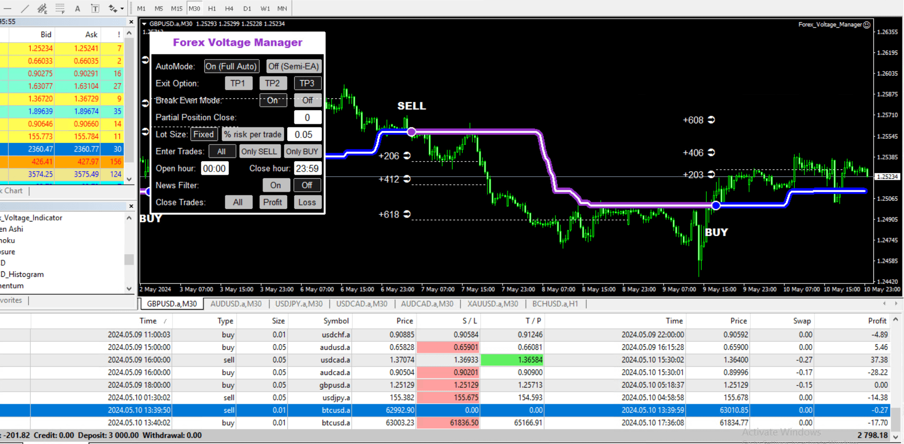 Forex Voltage caters to all styles, whether you’re a fan of hands-on trading or prefer a more automated approach. With options for semi-automated and 100% fully automated trading, this software can handle trades from entry to exit without your constant intervention. This includes several exit options like multiple TakeProfit levels and a unique Opposite signal feature.