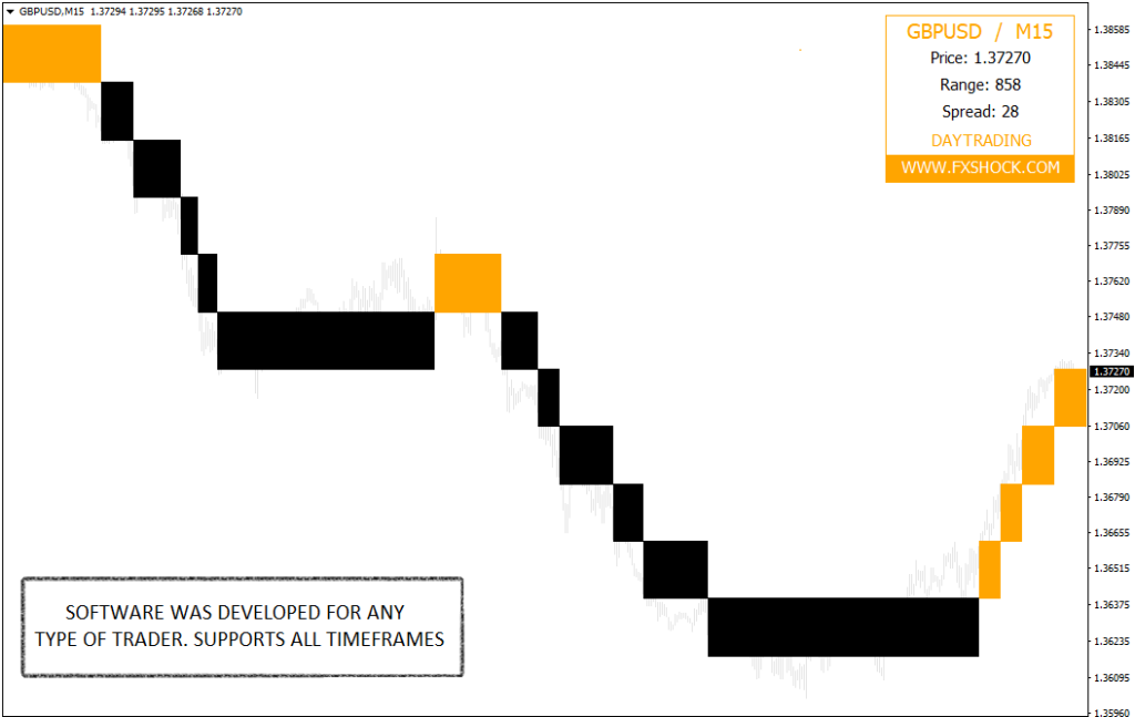 FXSHOCK Indicator System can be used on any Forex currency pair and other assets such as stocks, commodities, cryptos, precious metals, oil, gas, etc. You can also use it on any time frame that suits you best, from the 1 minute through to the 1-month charts.