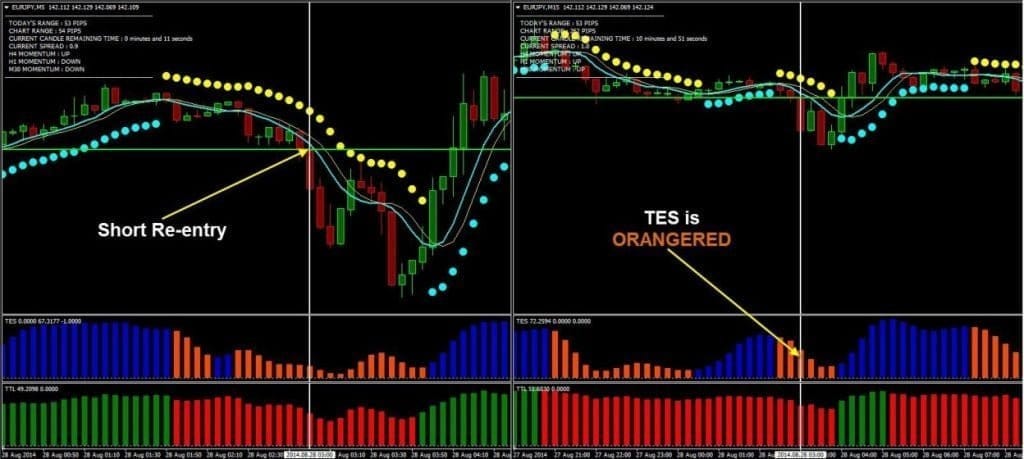 If all conditions were met, go to H4 (if we trade on H1) and look at the histogram indicators TES and TTL, their bars shall be painted orange and red. If the signal is confirmed we open a Short position.