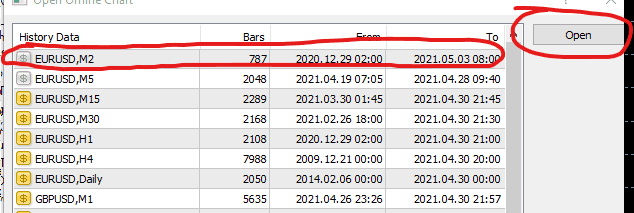 - If you previously Attach the EA to the EURUSD pair, you can find EURUSD M2 (if you can’t you may need to restart the MT4). Click Open it.